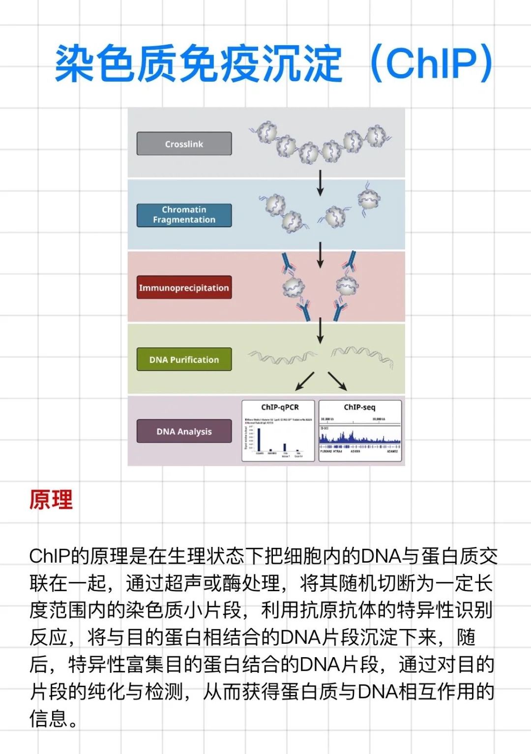 該技術(shù)通過(guò)交聯(lián)、細(xì)胞裂解、核酸剪切、抗體免疫沉淀、DNA樣本回收等一系列步驟,將蛋白-DNA復(fù)合物分離出來(lái),進(jìn)一步研究特定的結(jié)合蛋白或與其結(jié)合的DNA。