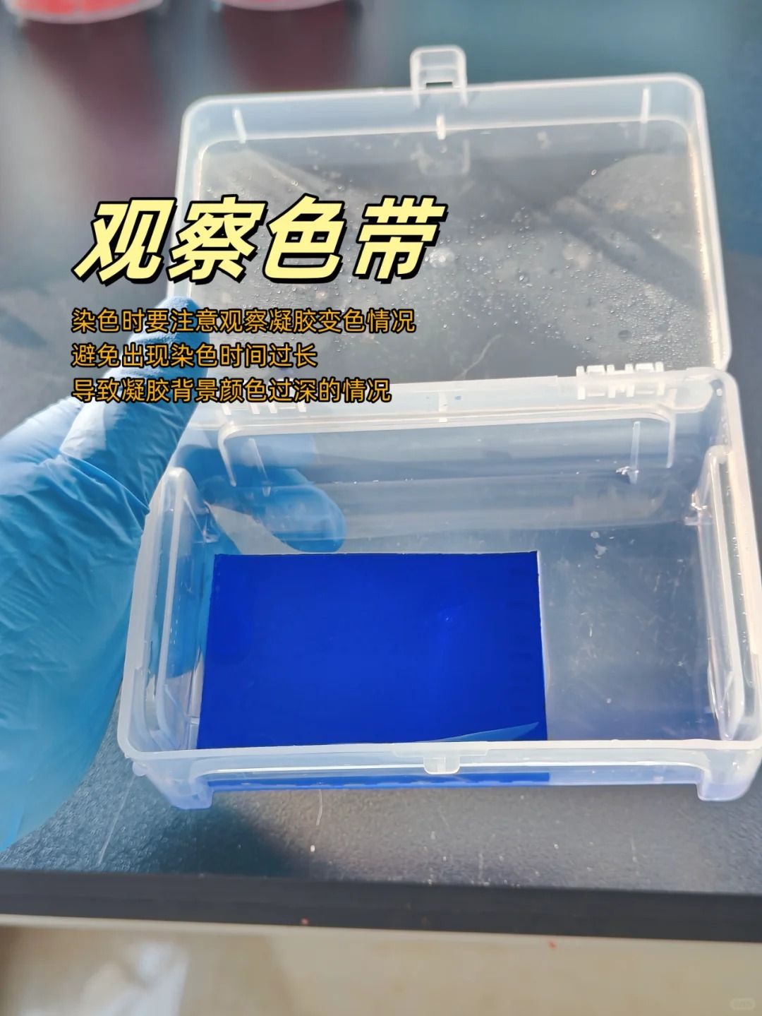 ▲觀察染色情況:在染色過程中,要時刻注意觀察凝膠的變色情況。當看到清晰的蛋白質染色條帶時,就說明染色已經差不多了。這時候,就要及時停止染色,避免背景顏色過深。