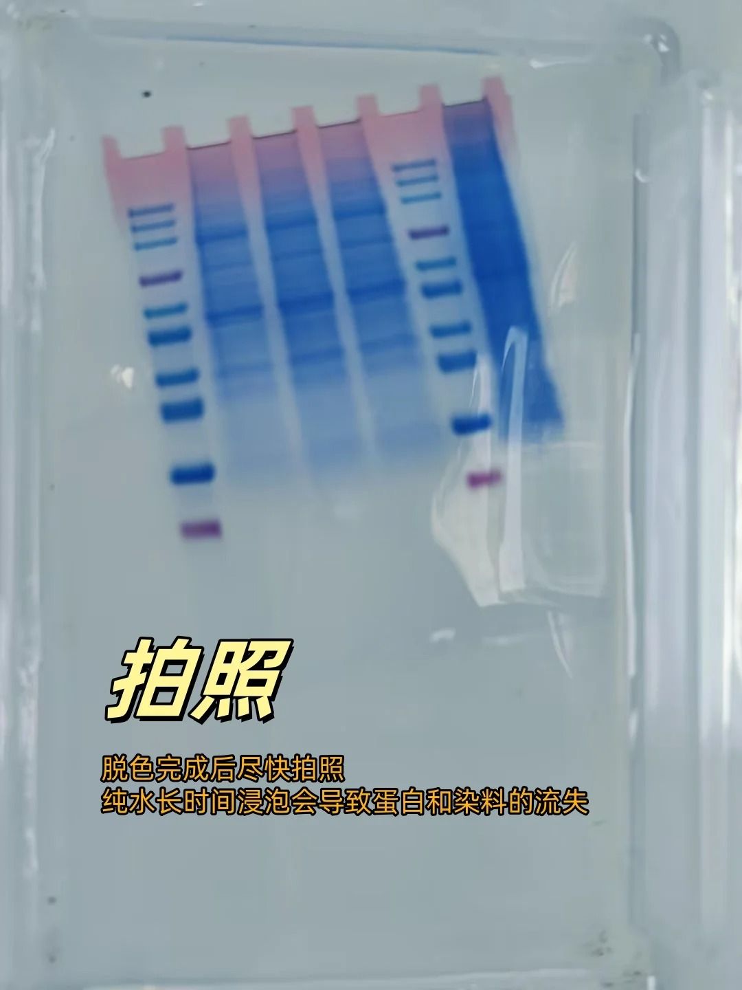 ?▲調整去染時間?:去染時間的長短會影響背景顏色的深淺。一般來說,去染時間越長,背景顏色越淺。你可以根據實驗需求調整去染時間,直到背景清晰、蛋白質條帶清晰可見為止。