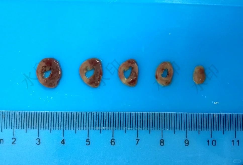 ⑶梗死面積與體積計(jì)算?:在病理圖文分析系統(tǒng)中,測(cè)量每片切片的梗死面積和總面積。梗死體積為該層梗死面積和層厚的乘積。將各層的梗死體積相加,即可得到總的梗死體積。
