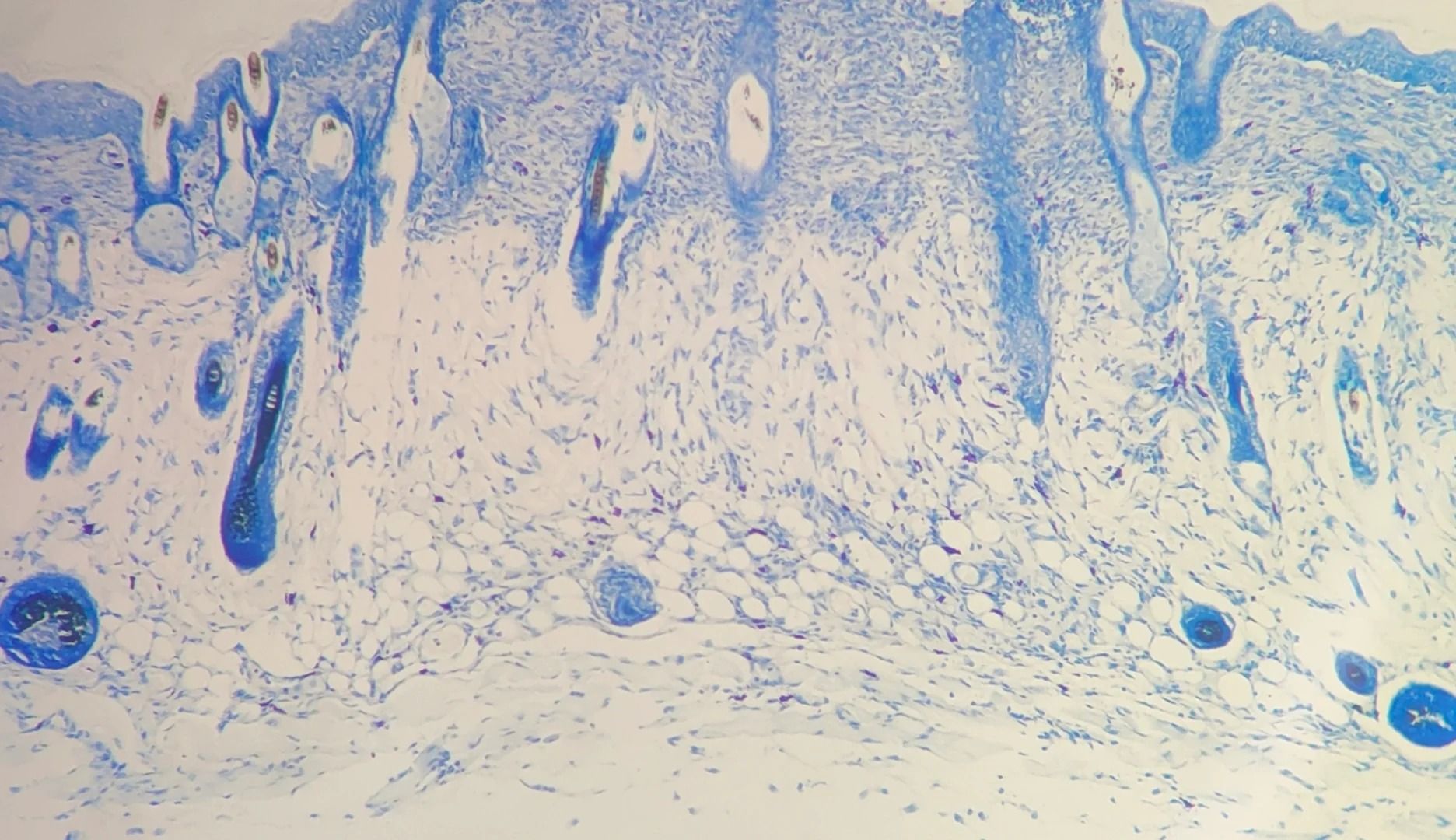 甲苯胺藍染色能夠清楚地顯示軟骨形態潮線等結構,有助于觀察軟骨組織是否有損傷。同時,它還能將組織內的肥大細胞清晰地顯示出來,便于觀察肥大細胞的數量分布變化情況及脫顆粒現象