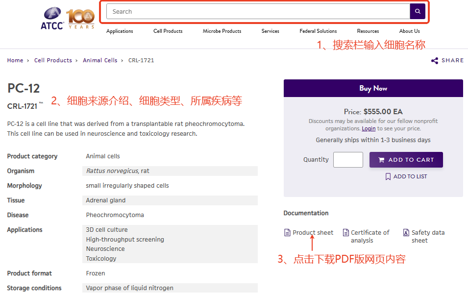 ATCC是一個非營利性的全球生物資源中心和標準組織,也是認證細胞系和微生物的領先開發商和供應商,擁有世界上最大、最廣泛的人類和動物研究細胞系產品目錄,包括原代細胞、永生化細胞系、干細胞、免疫細胞等。細胞系數據中包含了詳細的細胞表征信息,如形態學、分子標記、基因表達譜、增殖能力、傳代歷史、細胞標準形態圖等,無需注冊登入即可查詢和下載說明書。