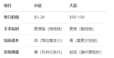 大鼠:生理結(jié)構(gòu)更接近人類,手術(shù)穩(wěn)定性更高,但成本更高。