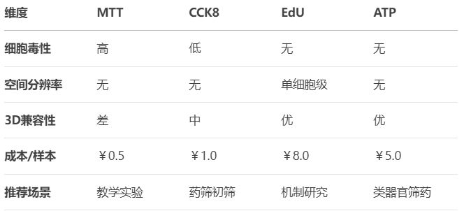 根據實驗目標選擇合適方法,結合雙軌驗證策略,將大幅提升數據可靠性——初篩選CCK8,機制解析用EdU,類器官優選ATP,MTT僅作備選。