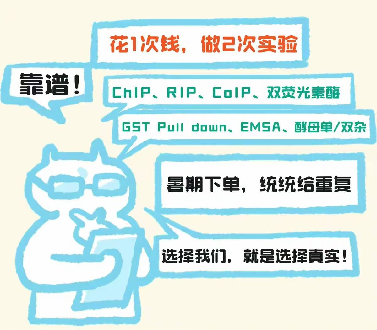 我們深刻理解數據可重復性對科研成果的重要性。本次活動中,所有下單的ChIP、RIP、CoIP、雙熒光素酶、GST Pull down、EMSA、酵母單/雙雜交等實驗服務,都將獲得重復實驗的特別保障。這意味著: