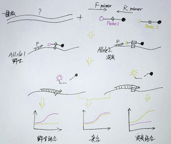 對于SNP分型檢測,體系中會含有針對不同基因型的探針(如下圖Probe1和Probe2),兩種探針5端通過標(biāo)記不同的熒光基團(tuán)進(jìn)行區(qū)分(通常使用的是FAM和VIC)。他們的序列中包含匹配不同基因型的堿基,堿基錯配將導(dǎo)致探針與模板的結(jié)合能力以及被切割的概率大大降低。因此,當(dāng)基因型為純合子時,只會檢測到單獨一種熒光信號,而對于雜合子,兩種熒光信號都將被檢測到。