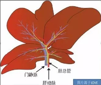5棉簽沾生理鹽水撥開肝臟、腸、胰等臟器,在肝臟底部尋找并暴露出膽管(大鼠沒有膽囊,在肝臟和十二指腸中間找,小鼠沿著膽囊和十二指腸找),膽管下可看到門靜脈血管,與門靜脈血管平行的透明黃色的為膽管。