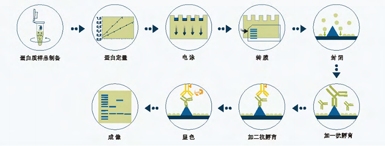 蛋白質(zhì)提取 -> 蛋白質(zhì)分離 -> 轉(zhuǎn)移 -> 阻斷 -> 一次抗體孵育 -> 二次抗體孵育 -> 檢測