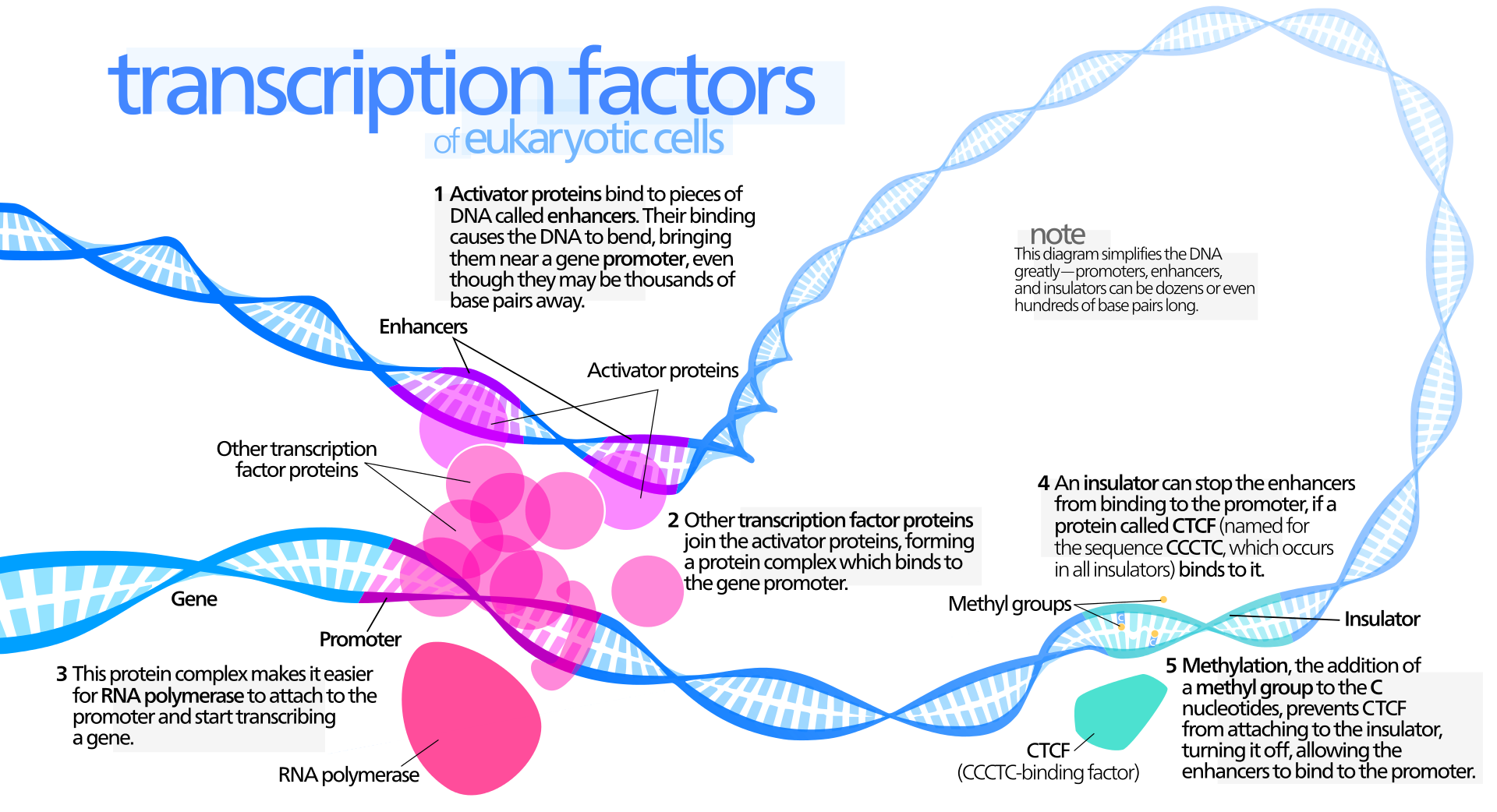 轉(zhuǎn)錄因子(Transcription Factor,TF)是一類可以結(jié)合到DNA上并影響RNA聚合酶復(fù)合物與啟動子相互作用的蛋白質(zhì)。它們的基本作用原理是結(jié)合到基因的啟動子區(qū)域并與RNA聚合酶II共同形成啟動復(fù)合物,從而促進(jìn)或抑制基因的轉(zhuǎn)錄,影響蛋白質(zhì)的合成和表達(dá)。轉(zhuǎn)錄因子通常被分為兩類:轉(zhuǎn)錄激活因子(ACTF)和轉(zhuǎn)錄抑制因子(Repressor)。轉(zhuǎn)錄激活因子一般結(jié)合在啟動子附近或上游區(qū)域,能夠招募RNA聚合酶并促進(jìn)基因的轉(zhuǎn)錄;而轉(zhuǎn)錄抑制因子則結(jié)合在啟動子區(qū)域或下游區(qū)域,能夠阻止RNA聚合酶對基因進(jìn)行轉(zhuǎn)錄。