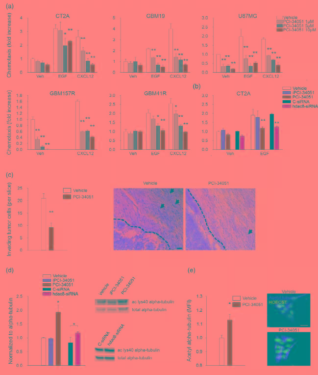 為研究HDAC8的抑制是否能減少膠質瘤細胞遷移從而影響腫瘤生長。作者用不同濃度HDAC8抑制劑PCI-34051下處理人和小鼠的膠質瘤細胞,發現PCI-34051降低了U87MG和GBM157細胞中Veh的表達,同時降低了五株膠質瘤細胞中EGF和CXCL12的表達,即降低了細胞的遷移能力(Figure 2A)。但是,iPCI-34051對腫瘤細胞CT2A無影響效果(Figure 2B),而HDAC8 siRNA的處理降低了CT2A中EGF的表達(Figure 2B)。此外,體內實驗發現,PCI-34051的干預降低了腫瘤細胞的侵襲性(Figure 2C)。WesternBlot和免疫熒光實驗證實,PCI-34051或HDAC8 siRNA能增加α-tubulin的乙酰化水平(Figure 2D-E)。這些數據表明,抑制HDAC8可減少膠質瘤細胞的遷移和侵襲,并增加α-tubulin的乙酰化。