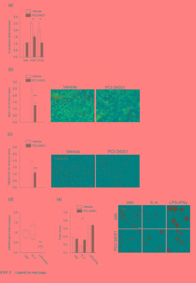 考慮到神經膠質瘤相關的小膠質細胞/巨噬細胞(GAMs)招募到膠質瘤團是支持腫瘤生長的關鍵機制,作者接下來探討HDAC8的抑制是否影響GAMs的遷移。 首先,分離原代小鼠膠質細胞。 用PCI-34051干預后發現HDAC8的抑制完全消除了小膠質細胞的趨化性(Figure 3A)。 同時,在用PCI-34051處理的小鼠后發現Iba1+細胞(小膠質細胞/巨噬細胞的標志物)浸潤腫瘤腫的數量減少(Figure 3B)。