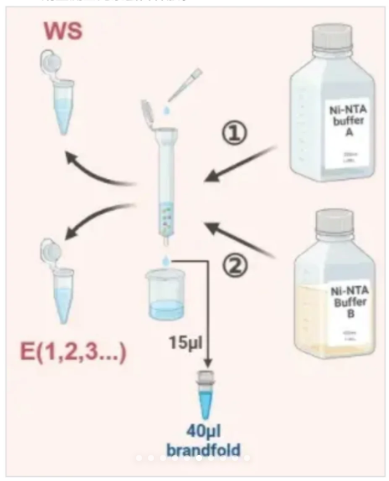 用 Ni-A 緩沖液洗去雜蛋白(收集 WS樣本),再用 Ni-B緩沖液洗脫目的蛋白(收集E樣本),通過 Bradford 試劑監(jiān)測(cè)至無雜蛋白釋放。