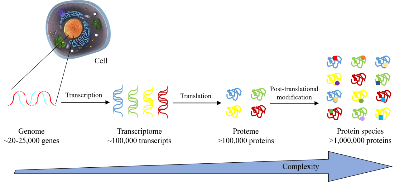 如果說,轉錄水平和mRNA 水平的變化增加了轉錄組相對于基因組的大小,那么無數種不同的蛋白質翻譯后修飾類型,則使得蛋白質組的大小相較于基因組和轉錄組呈現指數型的增加。目前,人體內的蛋白質總數已超過一億種。科學家們的目光也從基因組水平過渡到了更加復雜多變的蛋白質組,這,是一個必然的研究趨勢。