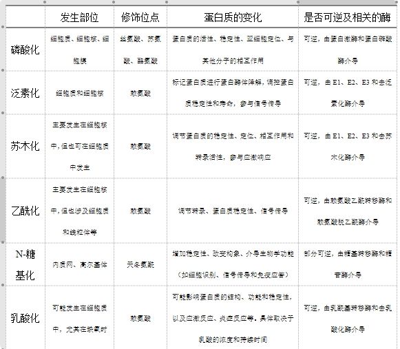 好了,上述我們給大家介紹了幾種常見的蛋白質修飾類型,現在咱們一起來總結一下。這里我們給大家繪制了一個表格(其中乳酸化作為一種新發現的蛋白質翻譯后修飾,其修飾的具體機制在現有研究中并不明確,因此我們根據相關研究進行了推測,僅供大家參考)。