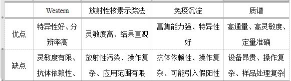 除質譜外還有一些其他的方法可以檢測蛋白質的翻譯后修飾,如Western Blot、放射性核素示蹤法、免疫沉淀(IP)等,下表展示了各類實驗方法檢測蛋白質翻譯后修飾的優缺點。