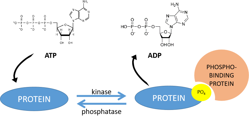 蛋白質磷酸化是指由蛋白質激酶催化的,將ATP(三磷酸腺苷)或GTP(三磷酸鳥苷)上的磷酸基團轉移到底物蛋白質氨基酸殘基(主要是絲氨酸、蘇氨酸、酪氨酸)上的過程。該過程的逆過程則稱為去磷酸化。添加磷酸基團的酶叫做蛋白激酶,移除磷酸基團的酶叫做蛋白磷酸酶。初高中時期我們學習的ATP和ADP的相互轉化,應該是我們生物學習中最早接觸的磷酸化和去磷酸化,也是目前最主要的信號轉導方式。