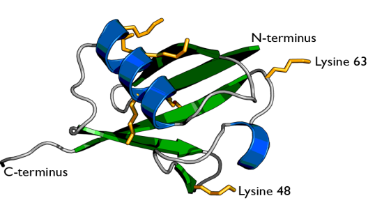 今天我們要學習的第二個蛋白質翻譯后修飾的類型是泛素化,在這之前也需要了解一些背景知識。首先問大家一個問題,什么是泛素?泛素是含76個氨基酸、大小約為8.6 kDa的小蛋白質。人類基因組中有四個基因編碼泛素:UBB,UBC,UBA52和RPS27A,泛素蛋白的氨基酸序列為:MQIFVKTLTGKTITLEVEPSDTIENVKAKIQDKEGIPPDQQRLIFAGKQLEDGRTLSDYNIQKESTLHLVLRLRGG。泛素具有7個賴氨酸殘基(K6,K11,K27,K29,K33,K48,K63)和一個甲硫氨酸殘基(M1)。泛素之間主要通過賴氨酸殘基和甲硫氨酸殘基進行連接,由此產生的泛素鏈具有一定的拓撲結構,可通過對蛋白底物進行修飾并決定底物的功能。