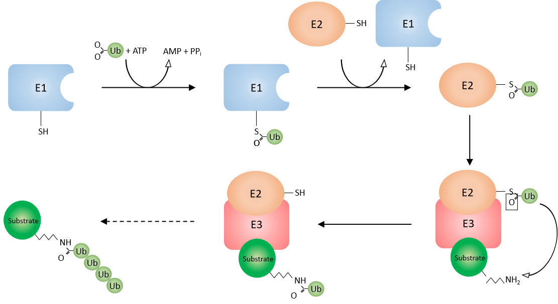 泛素化的過程主要涉及三種酶類,分別是泛素激活酶E1、泛素結合酶E2、泛素連接酶E3。人源的E1酶類有2種:UBA1和UBA6;人源的E2酶類有35種;人源E3酶類有數百種。其中E3泛素化連接酶決定靶蛋白的特異性識別。泛素化的過程具體可分為以下三個步驟:活化、結合、連接(動畫演示)