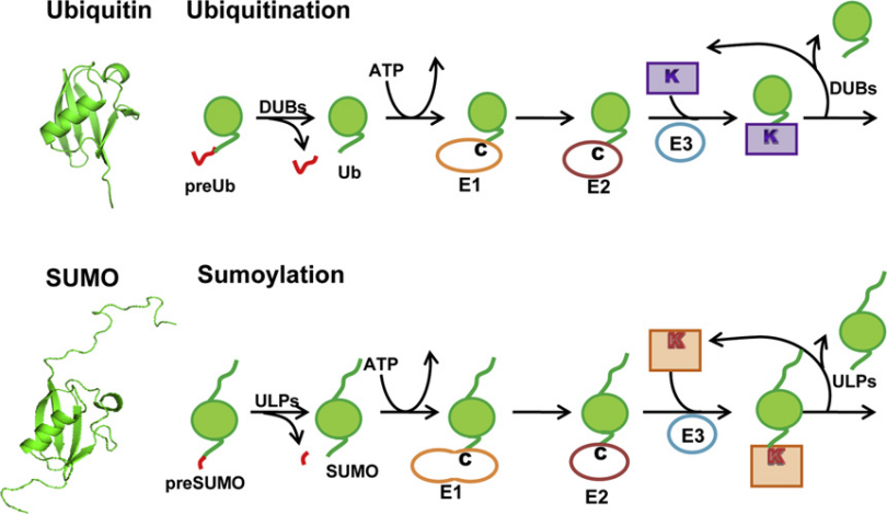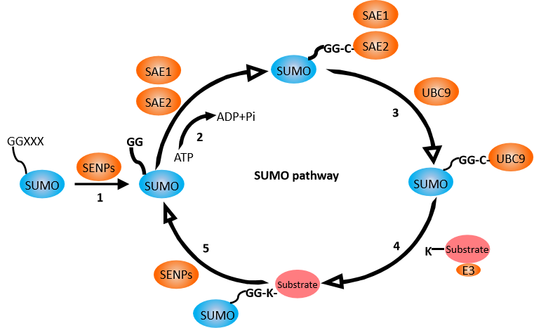 蛋白質蘇木化主要包括以下步驟:SUMO前體的成熟、活化、結合、連接等