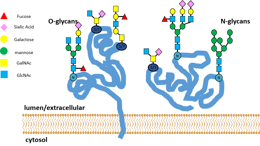 蛋白質糖基化主要有兩種類型:O-糖基化和N-糖基化。O-糖基化發生在絲氨酸(Ser)和蘇氨酸(Thr)的羥基上,如果這些氨基酸首先被羥基化,也可以發生在賴氨酸(Lys)和脯氨酸(Pro)上。O-糖基化由于沒有明確的共識序列或共同核心結構,因此研究較為復雜。