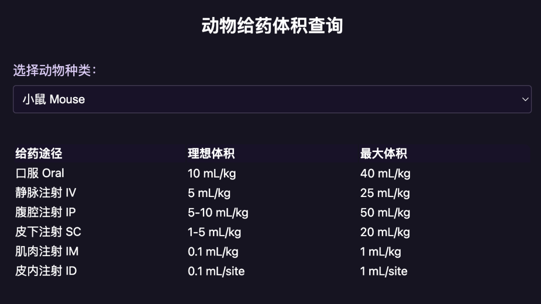 選擇所用動(dòng)物種類,就可以查詢到該物種不同給藥途徑的理想給藥體積。