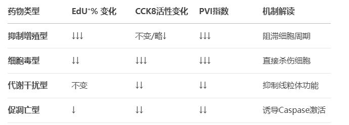 單一檢測指標常導致假陽性/假陰性誤判——CCK8僅反映代謝活性,無法區分靜息細胞;EdU只標記DNA合成,可能漏檢凋亡干擾。普拉特澤生物開發的EdU-CCK8雙軌驗證方案,可在96/384孔板中同步解析細胞真實增殖狀態與存活率,精準識別抑制增殖型、細胞毒型、代謝干擾型藥物,誤判率降低90%