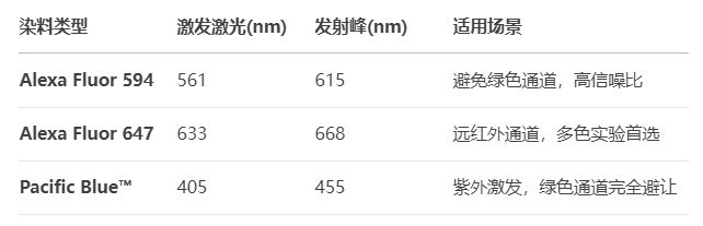 為EdU選擇非綠色通道染料:如AF647(遠紅)、AF594(橙紅)或Pacific Blue(藍)