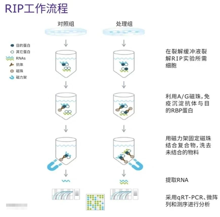 之前我們出過RNA免疫沉淀(RIP)實驗原理全面闡述,其基本原理基于抗體特異性識別,通過特異性抗體對靶蛋白進行免疫沉淀,然后提取并分析與之相互作用的RNA。實驗過程通常包括以下幾個步驟:
