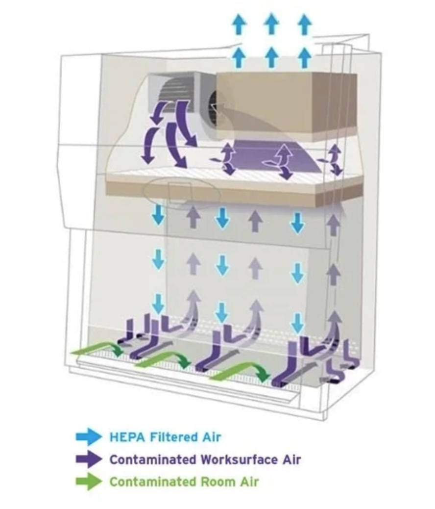 從下方的II級BSC工作原理圖可見,細胞房內的空氣經過操作臺面前端的氣孔被吸入BSC內,經過內部管道流通后,到達操作臺面上方的HEPA濾膜。經濾膜過濾后的空氣從上至下吹送至操作臺面。(見下圖)