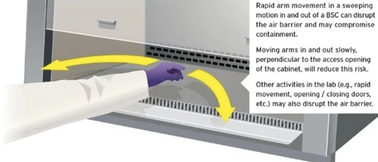 首先,正式操作時,操作者的手會多次伸入臺面,并在里面移動。我們應注意:1 手臂應與臺面呈垂直方向伸入;2 在內部左右移動時速度不要過快(見下圖)。這樣可以盡量降低手臂移動對垂直氣流帶來的擾動。