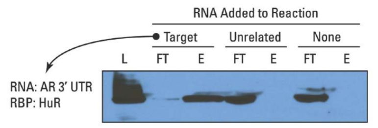RNA pull down是用于檢測RNA結合蛋白與其靶RNA之間互作的實驗手段。RNA pull down使用體外轉錄法標記生物素RNA探針,然后與胞漿蛋白提取液孵育,形成RNA-蛋白質復合物。該復合物可與鏈親和素標記的磁珠結合,從而與孵育液中的其他成分分離。復合物洗脫后,通過Western Blot實驗檢測特定的RNA結合蛋白是否與RNA相互作用。也可以通過質譜檢測實驗進行未知的互作蛋白鑒定。