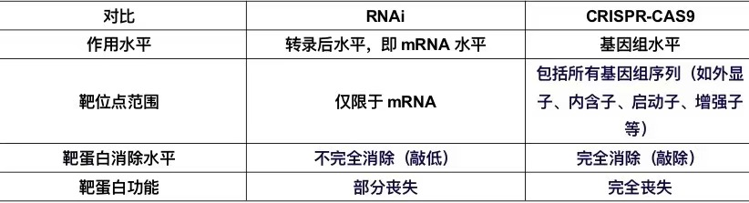 RNAi和CRISPR-Cas9在作用水平、靶位點(diǎn)范圍、靶蛋白消除水平以及靶蛋白功能等方面存在顯著差異。選擇哪種技術(shù)取決于具體的研究目的和實(shí)驗(yàn)需求。