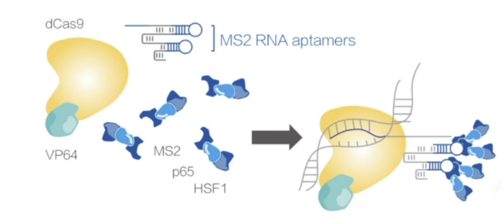 在CRISPRa技術(shù)中,使用的是dCas9蛋白,這是一種經(jīng)過改造的Cas9蛋白,其核酸酶活性被失活,因此無法切割DNA。然而,dCas9蛋白仍然能夠保留其DNA結(jié)合能力,即能夠特異性地識別并結(jié)合到目標(biāo)DNA序列上。為了實(shí)現(xiàn)基因轉(zhuǎn)錄激活,dCas9蛋白被進(jìn)一步改造,與特定轉(zhuǎn)錄激活因子(VP64,MS2等)相融合。當(dāng)我們把gRNA的設(shè)計在某個基因的啟動子上,那么這些轉(zhuǎn)錄因子就一股腦的到了這個啟動子附近,這些轉(zhuǎn)錄激活因子通常具有上調(diào)啟動子的活性,增加轉(zhuǎn)錄