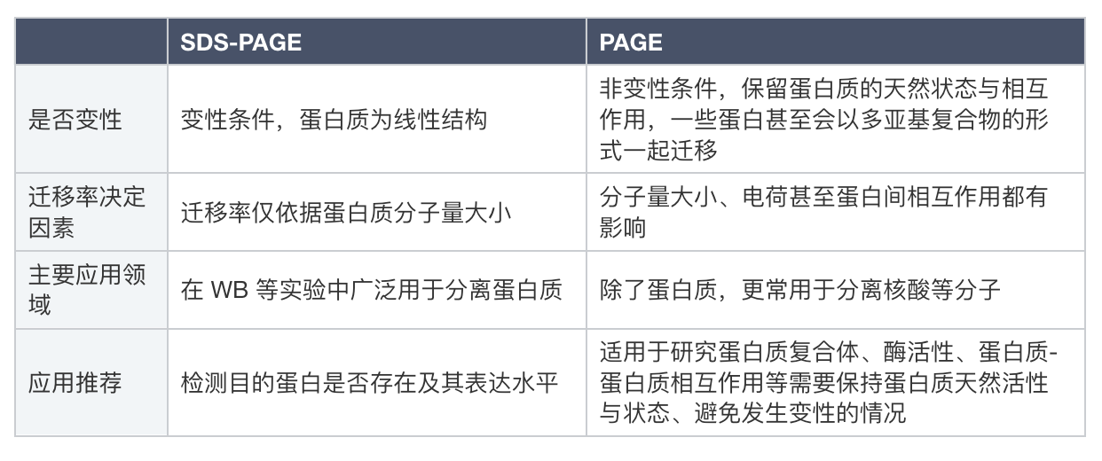 答:SDS-PAGE 毫無疑問是 PAGE 的升級版,二者都是常用的電泳分離技術,尤其是 SDS-PAGE更為常用,幾乎是 WB 實驗的標配;而 PAGE(或強調為NativePAGE)相比之下在蛋白質實驗中較少用到。