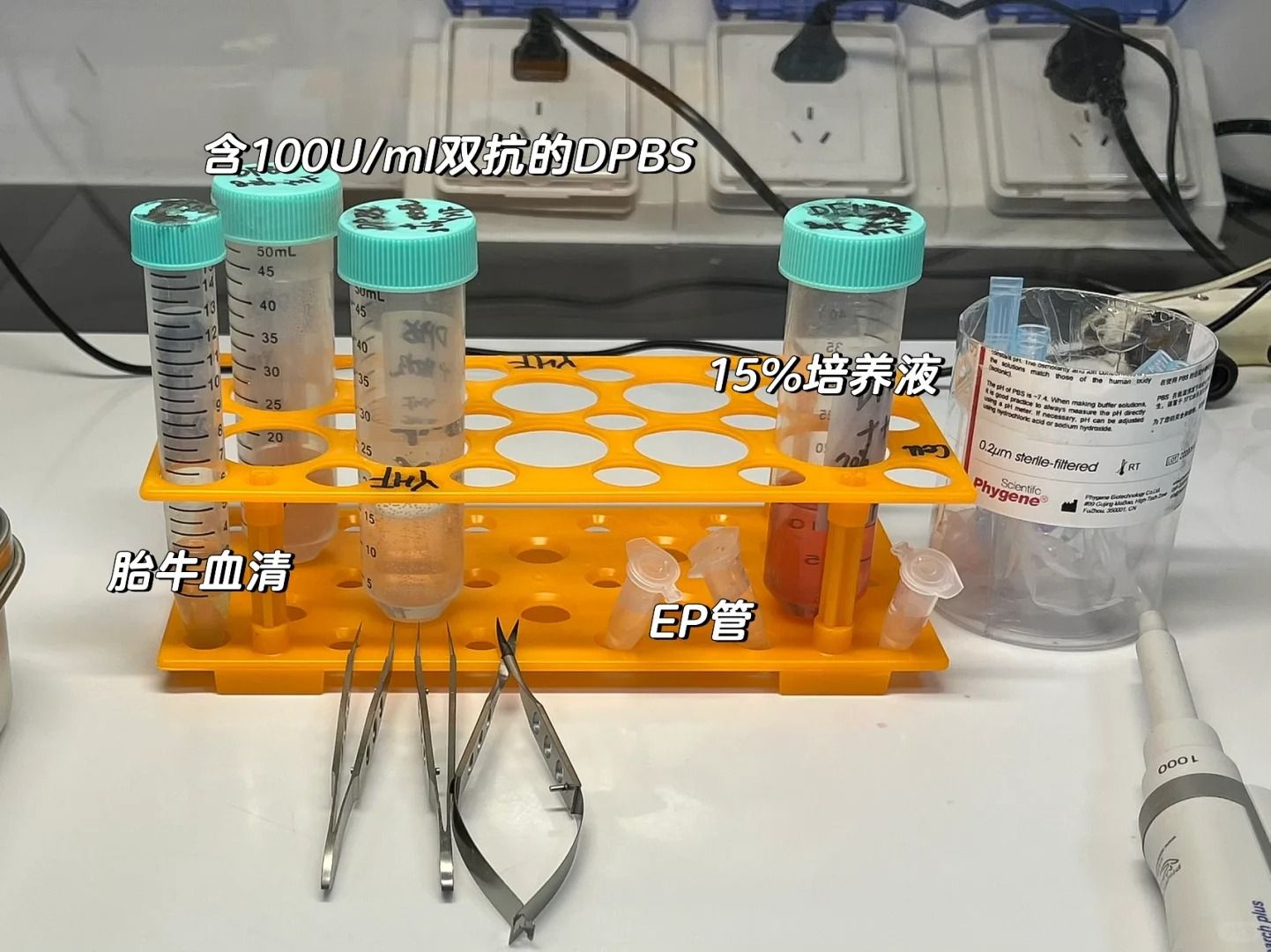 一次性注射器、手術器械(如眼科剪、眼科鑷)、離心管、細胞培養皿、移液槍及槍頭等,并確保所有金屬器械經過高壓滅菌,離心管輻照消毒。