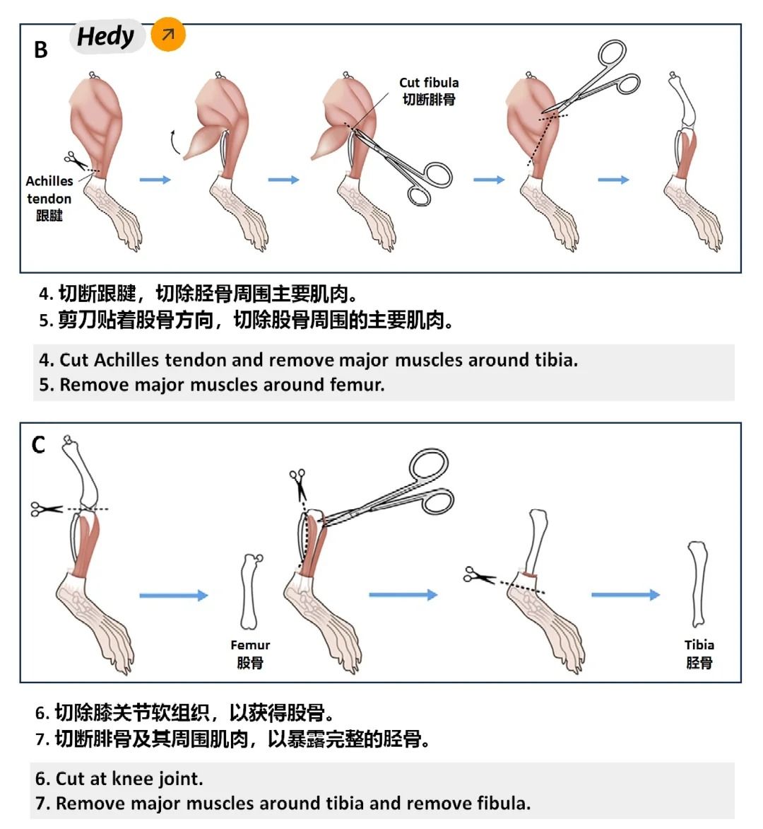 ①處死小鼠后,用剪刀和鑷子取出其雙側股骨和脛骨,剔除附著的肌肉和組織。