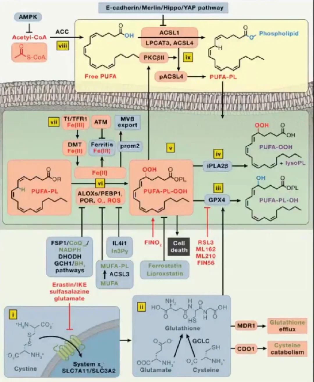 答:細胞鐵死亡它依賴于細胞內鐵的累積導致的脂質過氧化,涉及GPX4(谷胱甘肽過氧化物酶4)、鐵蓄積、脂代謝異常及非GPX4依賴性機制。
