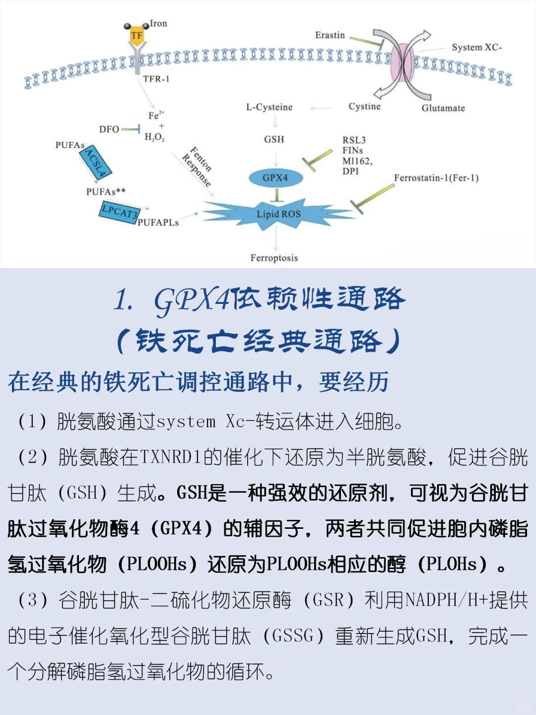 胱氨酸/谷氨酸反向轉(zhuǎn)運(yùn)體系(System xc-)是細(xì)胞獲取胱氨酸的主要途徑,而胱氨酸是合成谷胱甘肽的重要前體。小分子erastin通過抑制System xc-,降低了細(xì)胞對胱氨酸的獲取,導(dǎo)致谷胱甘肽合成受阻,進(jìn)而引發(fā)膜脂ROS的積累和鐵死亡。