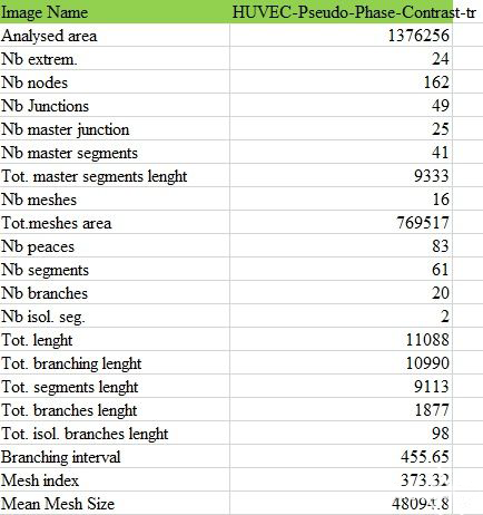 3. File -> Save as…即可保存結果到Excel表格,Angiogenesis Analyzer插件可以得到如下諸多結果: