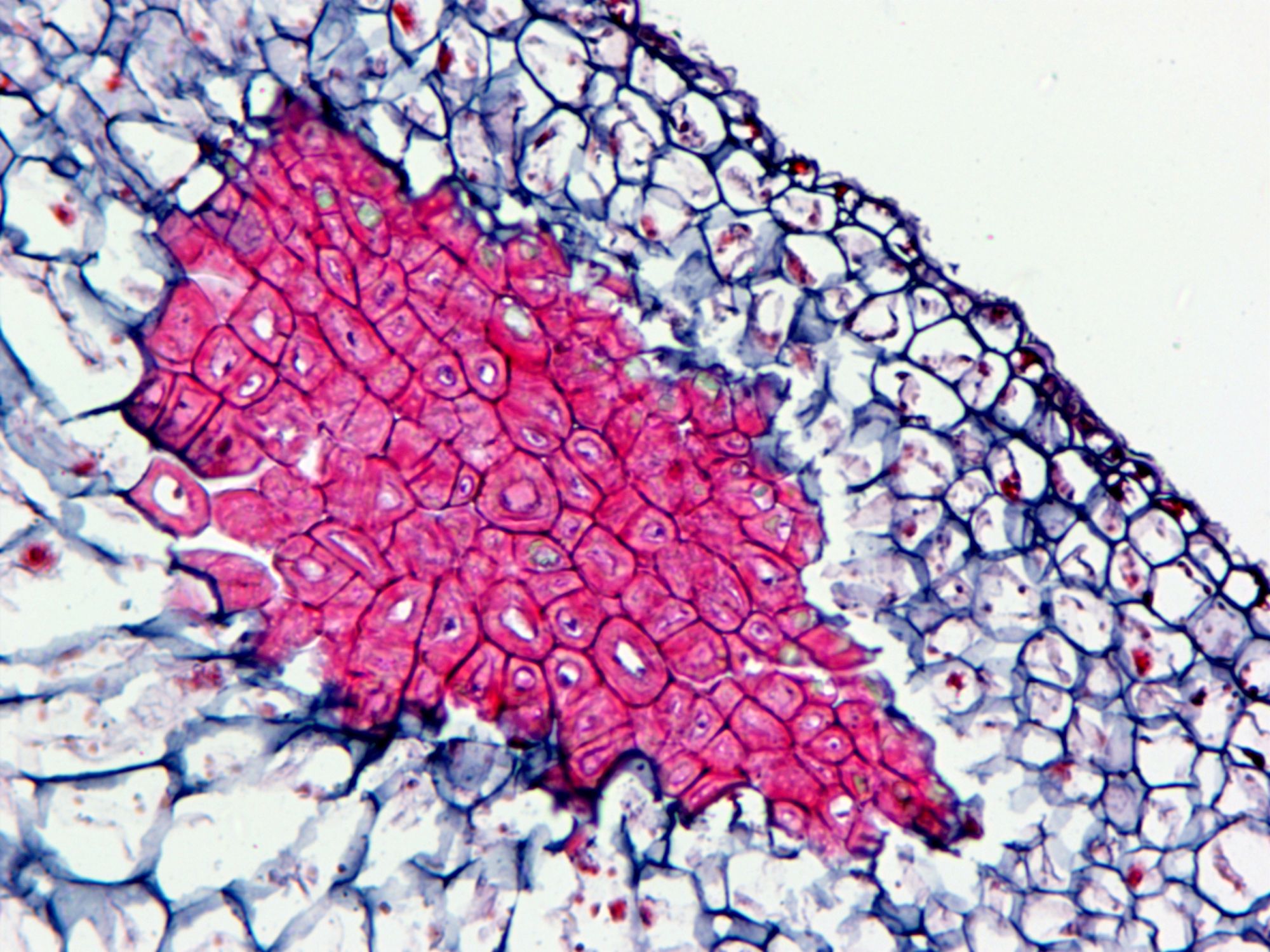植物組織番紅固綠染色實(shí)驗(yàn)原理:番紅是堿性染料能顯示維管束植物木質(zhì)化、木栓化和角質(zhì)化的組織。固綠是酸性染料,是一種含有漿質(zhì)的纖維素細(xì)胞組織的染色劑。導(dǎo)管可以被番紅染色,篩管可以被固綠染色。木質(zhì)化的細(xì)胞壁及核呈紅色,薄壁細(xì)胞及細(xì)胞質(zhì)呈綠色。
