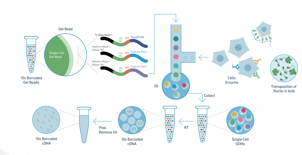 Barcoding Technology)標(biāo)記的細(xì)胞,用轉(zhuǎn)座酶處理的細(xì)胞核。接下來凝膠珠和單個細(xì)胞被油-表面活性劑溶液包裹,形成
