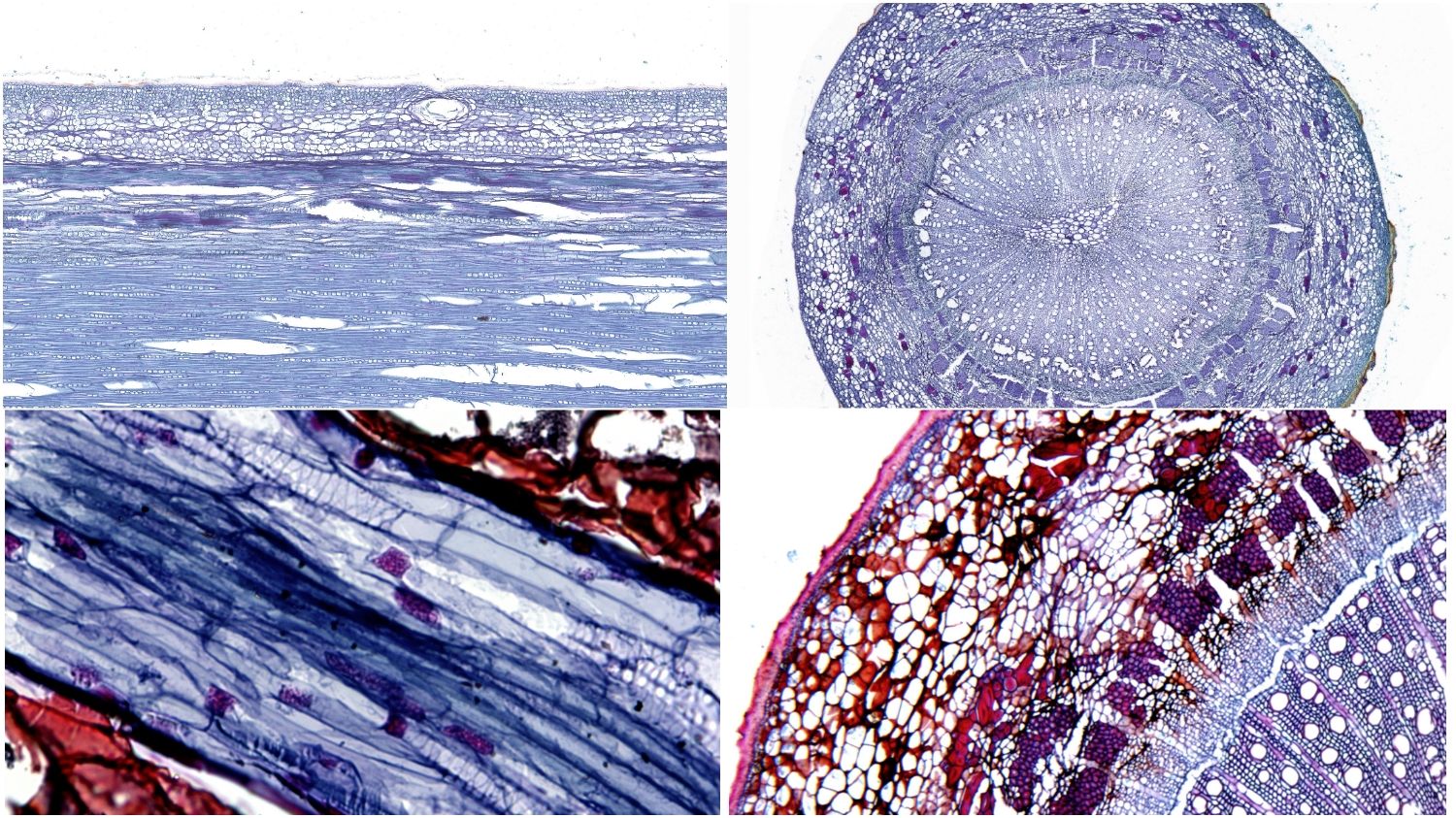 2. 木質(zhì)化的細(xì)胞壁及核呈紅色,薄壁細(xì)胞及細(xì)胞質(zhì)呈綠色。