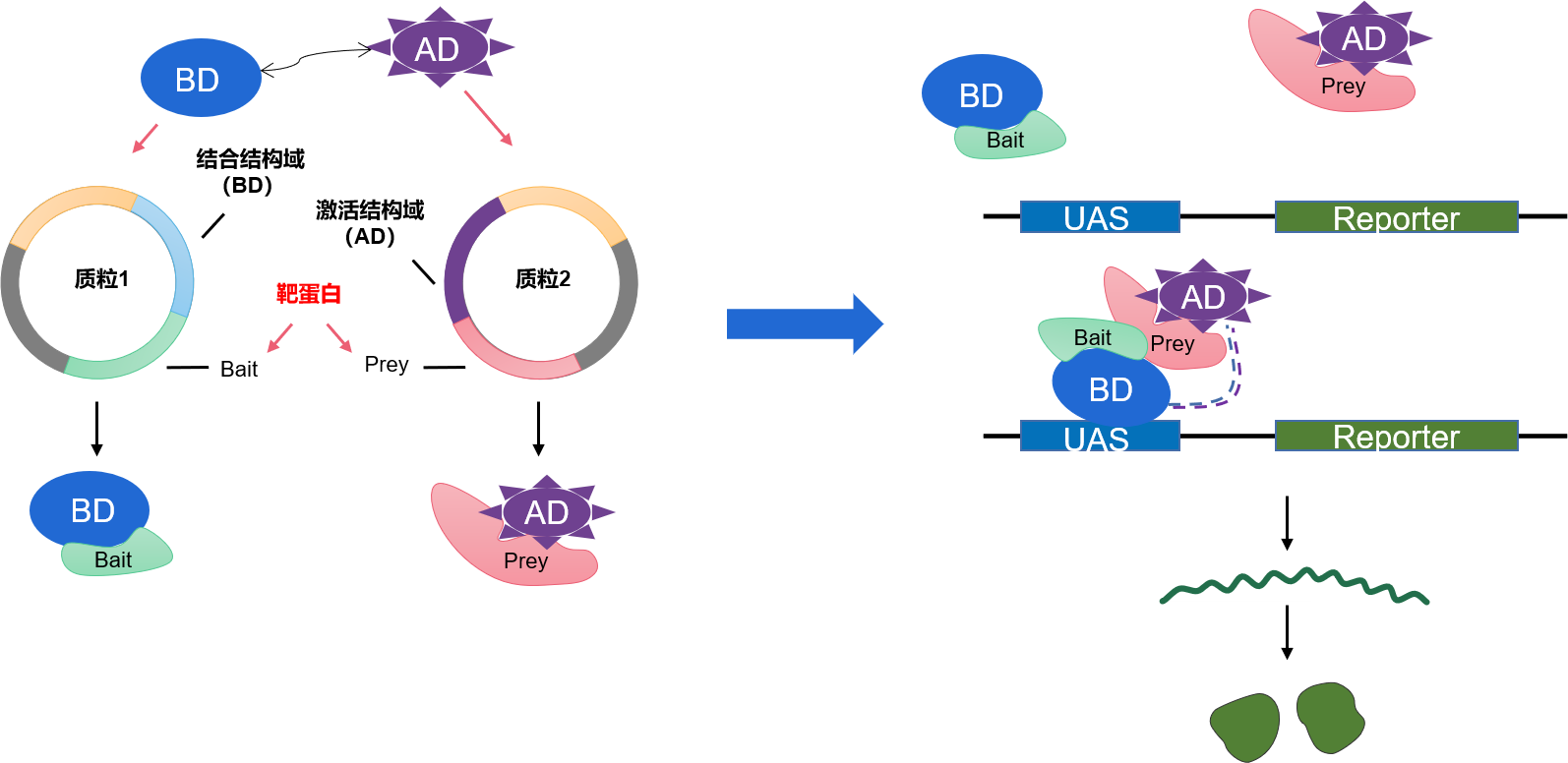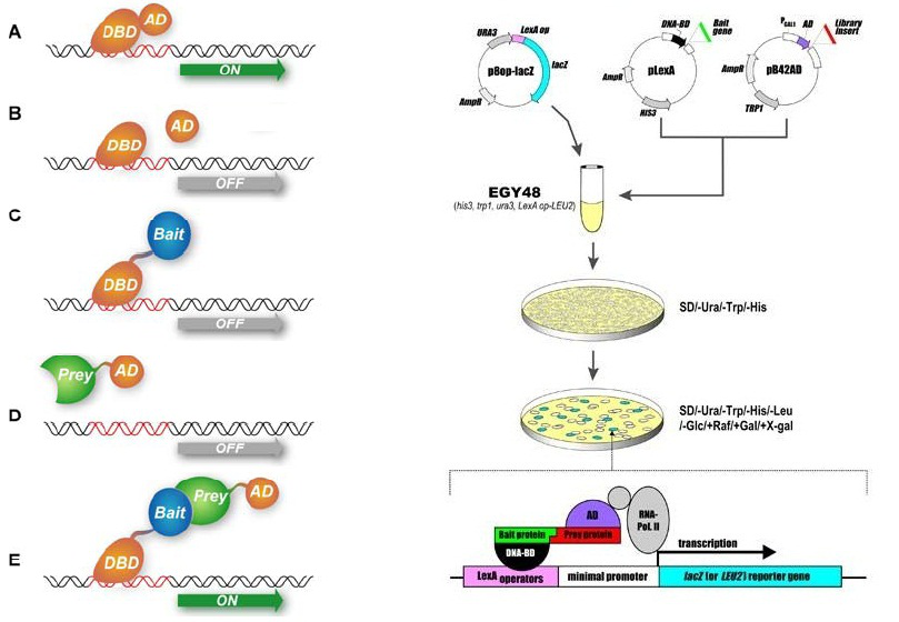酵母雙雜交系統的建立基于對真核生物調控轉錄起始過程的認識。酵母轉錄因子GAL4含兩個結構域:DNA結合功能域和轉錄激活結構域,前者可識別DNA上的特異序列,并使轉錄激活結構域定位于所調節基因的上游,后者同轉錄復合體的其他成分作用,啟動相應基因的轉錄。將編碼DNA結合功能域的基因與已知誘餌蛋白質基因構建在同一個表達載體上,在酵母中表達兩者的融合蛋白,將編碼DNA轉錄激活域的基因和cDNA文庫的基因構建在AD-LIBRARY表達載體上,同時將上述兩種載體轉化改造后的酵母。當兩種載體所表達的融合蛋白能夠相互作用時,功能重建的反式作用因子能夠激活酵母基因組中的報告基因,從而通過功能互補和顯色反應篩選到陽性菌落。將陽性反應的酵母菌株中的AD-LIBRARY載體提取分離出來,從而對載體中插入的文庫基因進行測序和分析工作。