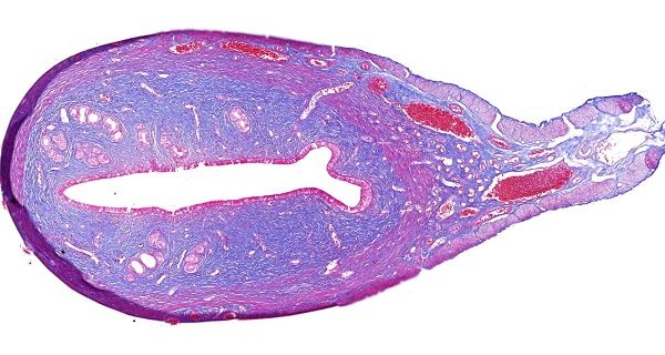 Masson染色時膠原纖維呈藍色(被苯胺藍所染)或綠色(被亮綠所染),肌纖維呈紅色(被酸性品紅和麗春紅所染),這與陰離子染料分子的大小和組織的滲透性有關。如已固定的組織用一系列陰離子水溶性染料先后或混合染色,則可發現紅細胞被最小分子的陰離子染料著染,肌纖維與胞質被中等大小的陰離子染料著染,而膠原纖維則被大分子的陰離子染料著染。由此說明了紅細胞對陰離子染料的滲透性最小,肌纖維與胞質次之,而膠原纖維具有最大的滲透性。根據組織不同的滲透性能,選擇分子大小不同的陰離子染料進行染色,便可把不同組織成分顯示出來。