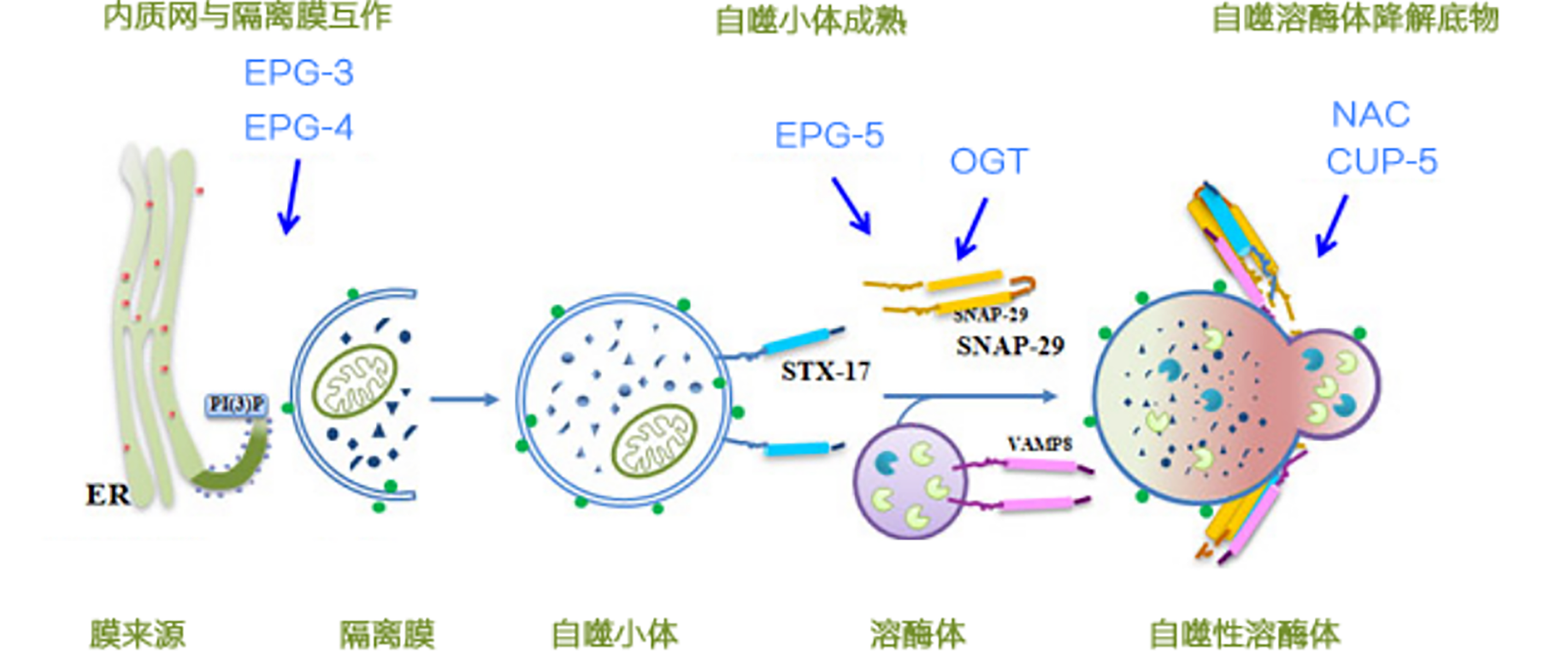 2.初始自體吞噬泡形成:囊泡最終形成雙層膜結構,即自吞噬體,也稱之為初始自體吞噬泡。