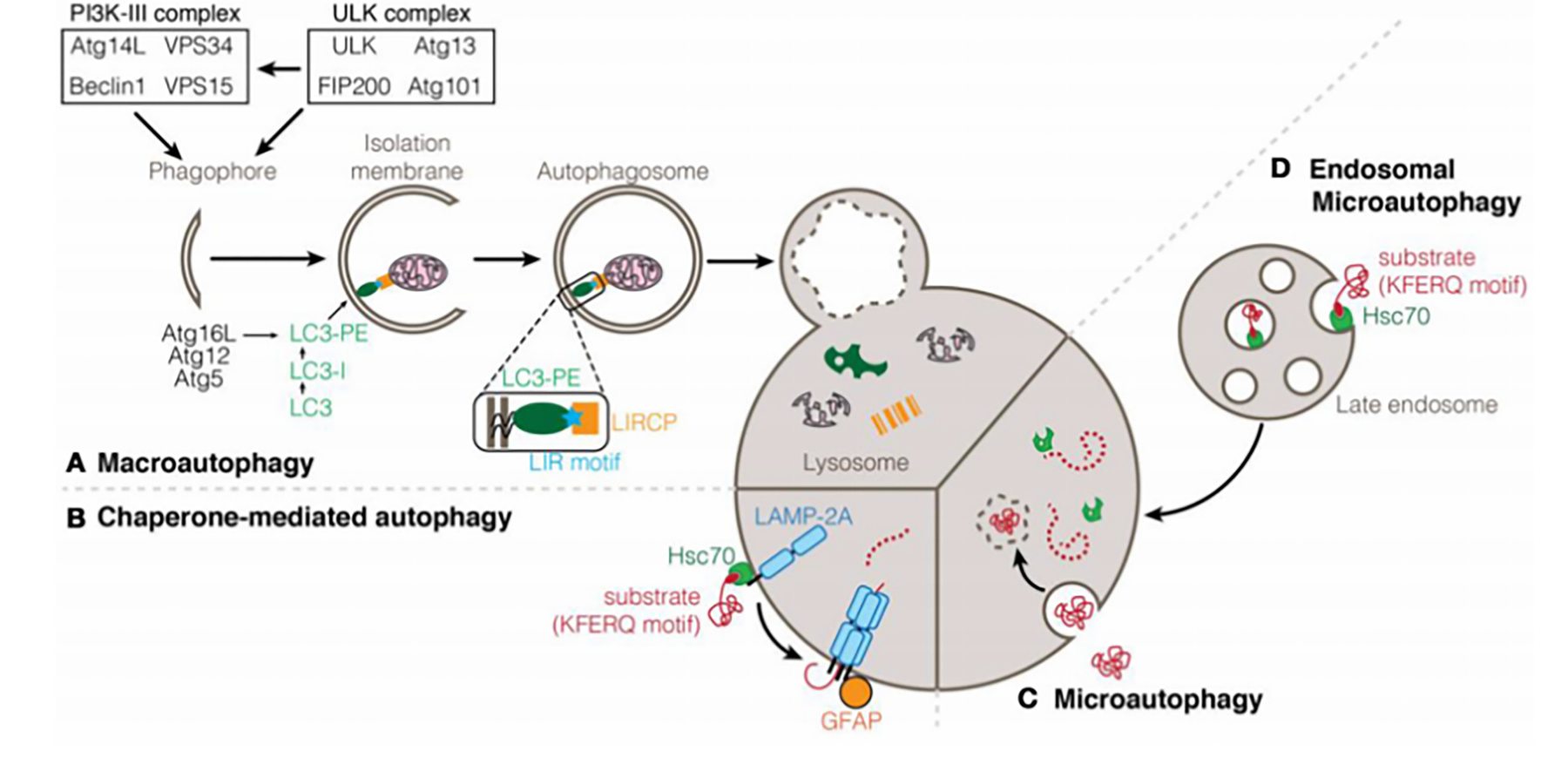 分子伴侶介導的自噬(CMA) :胞質內蛋白結合到分子伴侶后被轉運到溶酶體腔中,然后被溶酶體酶消化。CMA 的底物是可溶的蛋白質分子,在清除蛋白質時有選擇 性,而前兩者無明顯的選擇性。