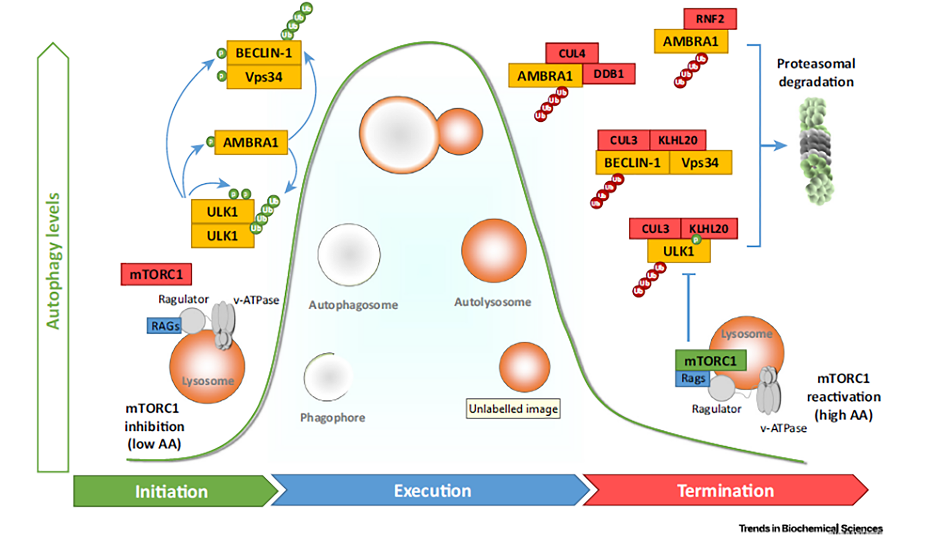 營養缺乏導致mTORC1失活,從溶酶體膜游離,激活許多翻譯后修飾促進ULK和VPS34復合物的活化(即自噬起始)。一旦ULK和VPS34復合物被激活,自噬的執行程序被允許(即自噬的執行)。自噬終止:由E3泛素連接酶執行的ULK和BECLIN-1活性復合物介導完成。此外,由溶酶體消化產生的氨基酸重新激活mTORC1,它能夠反過來抑制自噬發生。(來自綜述:Emerging Mechanismsin Initiating and Terminating Autophagy)